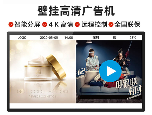 壁掛廣告機是一種全新的媒體概念,指的是在大型商場、超市、酒店大堂、飯店、影院及其他人流匯聚的公共場所,通過大屏幕終端顯示設備,發(fā)布商業(yè)、財經和娛樂信息的多媒體專業(yè)視聽系統(tǒng)。